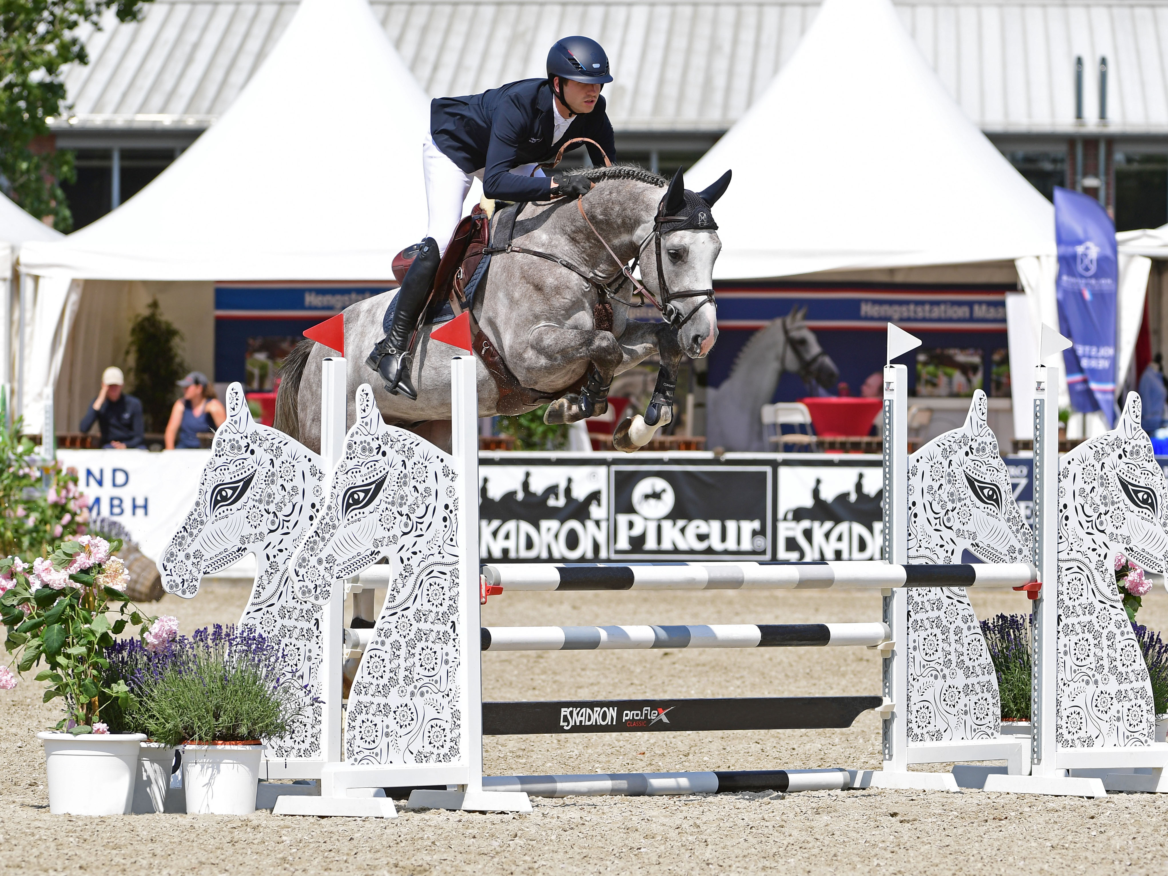 Mit der gewichteten springbetonten Endnote von 8,30 schloss der Schimmel unter Lucas Wenz die Kurz-Veranlagungsprüfung in Vechta ab. „Ein Springer“, lautete die Zusammenfassung der Bewertungskommission, die United Pleasure eine 9,0 für die Leistungsbereitschaft und eine 8,8 für die Springanlage eintrug. Besonders beim Freispringen fiel der vermögende Schimmel auf: „Ein Hengst, der mit unglaublich viel Vermögen ausgestattet ist. Mit viel Go hat er dennoch gute Übersicht am Sprung – das wird ihm sicherlich noch zugutekommen.“ United Pleasure vergoldete unter Lucas Wenz gleich seine erste Turniersaison: Die beiden gewannen mehrere Springpferdeprüfungen und wurden bei den Holsteiner Pferdetagen souverän zu Landeschampions gekürt. Aus seinem ersten Fohlenjahrgang konnte sich ein United Pleasure-Sohn direkt zum Landesfohlenchampionat in Elmshorn empfehlen.