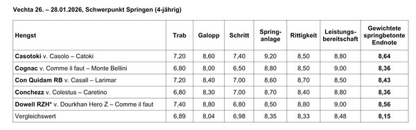 Die beste Springveranlagung (9,2) wurde in diesem Durchgang dem Casolo-Catoki-Sohn Casotoki von der Kommission attestiert. Der Hengst aus der Zucht von Tjark Witt erzielte das drittbeste Gesamtergebnis (8,64).