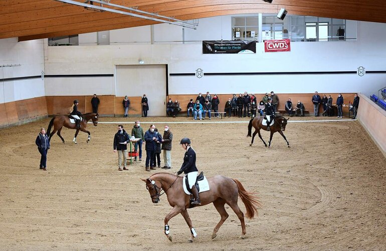 Das waren eine Tochter des Colore-Com Air, die mit der Gesamtnote 8,50 abschloss und eine dressurbetonte Stute v. Sir Donnerhall-Aljano, die eine 8,45 als Gesamtnote erhielt. Außerdem eine Tochter des Million Dollar aus einer Connor-Mutter: Sie erreichte eine 8,16 als Endnote. Die vierte Stute kam auf ein Endergebnis von 8,08 und stammt ab v. Casall-Cormint.