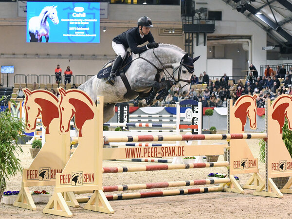 Cahil completed 14-day ability assessment at Neustadt upon Dosse in 2020 with very good results. He was given 9.0 on free jumping ability, willingness to perform and ridability (test rider). He completed the test with a total mark of 8.78 (jumping weighted). In the 2021, he completed sport testing for four-year-old stallions in Verden, where he received the final mark 8.22 (jumping weighted). In March 2022, Cahil completed part II of his sport test in Verden with a final weighted mark of 8.25. Four-year-old, he already won young horse jumping classes at A level. Having undergone a great development, physically as well as under saddle, the stallion has been placed in young horse jumping classes up to M level in 2022.