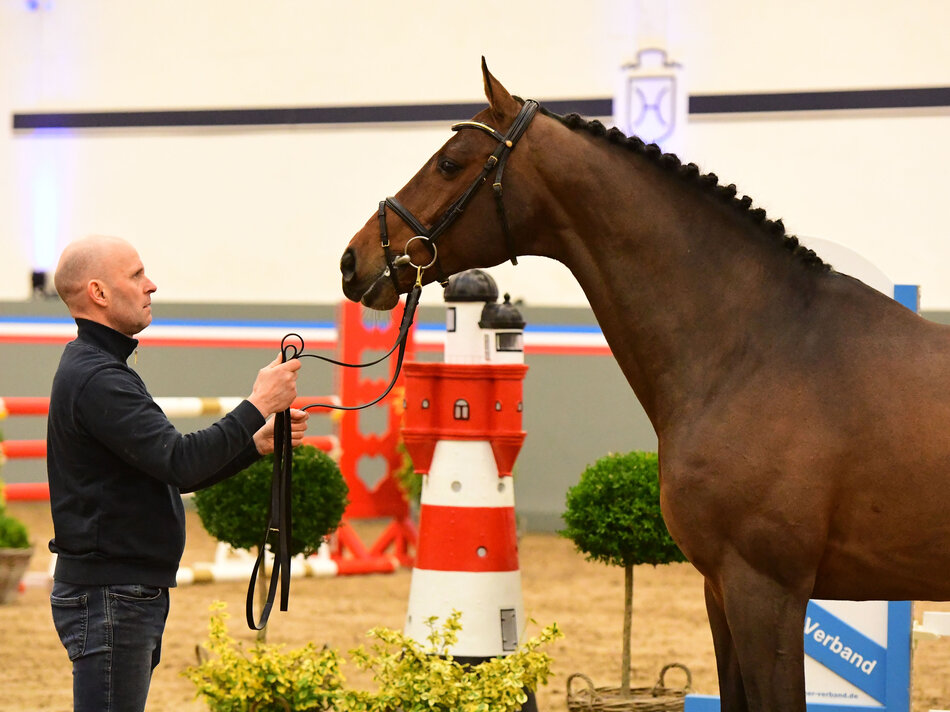 The four-year-old and older stallions were presented jumping a course under the rider. Like for example Camino Royal by Clarimo, a half-brother to Keaton with very good hooves and correct legs. Or else Dominator Z offspring Daikon, presented by Mascha Krause. “He is showing good judgement and does a long jump, but is still in the early training stages and quite playful, which is absolutely normal for a four-year-old”, said Tjark Nagel, who has a long-standing tradition in commenting the stallion parade.