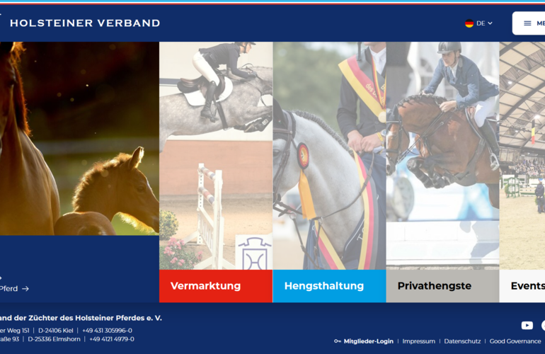 The entire association, the marketing and auction GmbH, the stallion keeping GmbH, the private stallion keeping and numerous association-spanning events - to present all these components clearly on one website has proven to be a challenge in the past. However, the past years and months have once again shown us how important progressive digitalization is in all areas of everyday life. On the new website, which can still be found at www.holsteiner-verband.de, each "department" has its own home page. A mouse click on the corresponding photos takes you directly to the relevant section. So you can quickly find what you are looking for: Each category has its own news, highlights and video box. In addition, you can access the social media presences from every page.