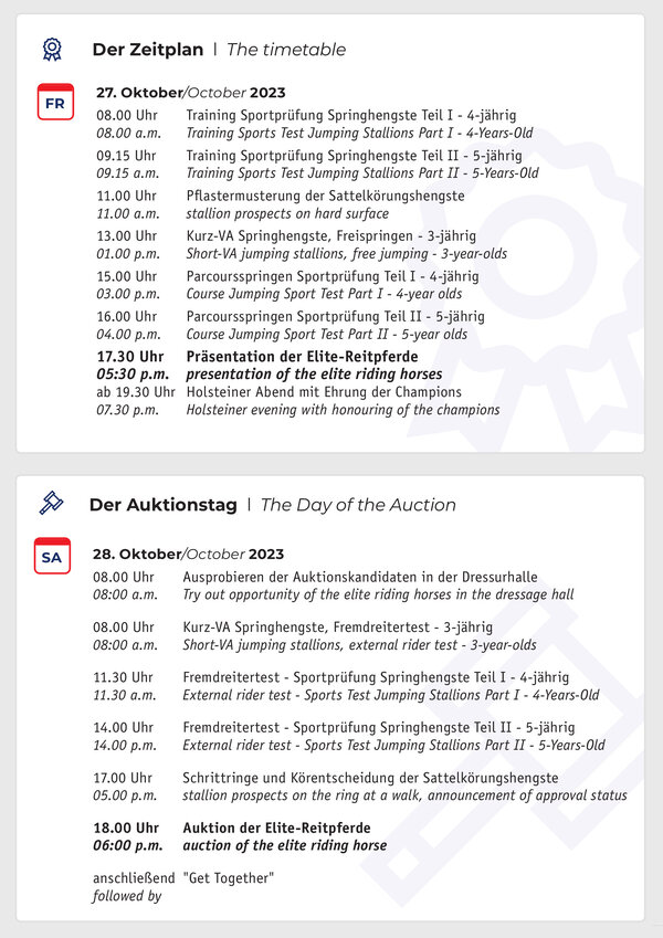 Even though we could continue with the long list of the Holsteiner elite riding horses’ own and relative performance, a live impression of this collection should be much more convincing. The presentation of the horses on Sunday, 8 October at 3pm in the Fritz-Thiedemann-indoor arena at Elmshorn is also livestreamed by ClipMyHorse.tv. Afterwards the horses can be tried out until 28 October, when the auction starts at 6pm. The “Holstein meets Italy“-themed auction combines classic Holsteiner charm with Mediterranean cooking, music and the appropriate ambience. Entry is free. Felix Flinzer (phone +49 162-3493942) is happy to answer all your questions on the horses and the auction and how to try out the horses. All auction candidates are available for online viewing with photos, videos and information on relatives’ performance on www.holsteiner.auction.