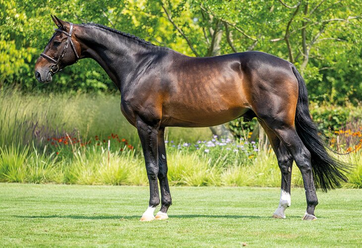 Dieser Hengst wartet mit sehr gutem Fundament und gewaltiger Vorderhandtechnik auf. Er ist in der Lage, insbesondere Stuten von kleinerem Rahmen mit kurzen Rücken in der Nachzucht zu verbessern.