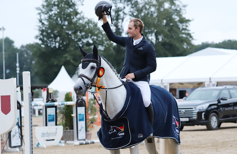 Der Schimmel und Richard Vogel waren die Schnellsten in dem Zwei-Phasen-Springen und ließen sich die Siegerschleife anstecken.