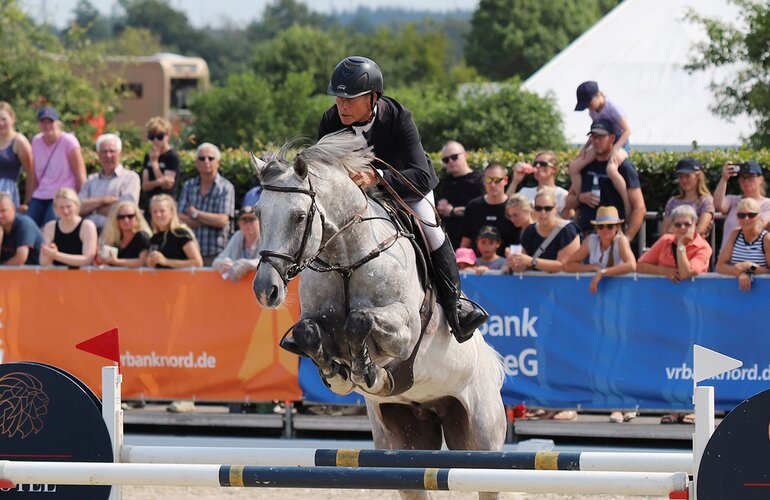 Der Zirocco Blue-Caretino-Sohn Zuccero (Hanno Köhncke, Badendorf), Stamm 4539, und Rolf-Göran Bengtsson haben in Schweden ein 1,45 Meter-Springen gewonnen.