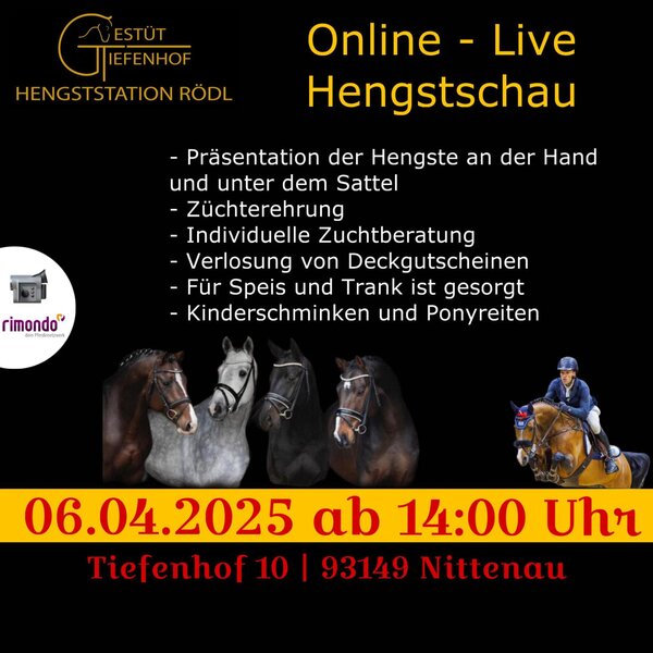 Eine der größten deutschen privaten Hengststationen öffnet am 06.04.25 ab 14:00 Uhr die Tore für eine Online - Live Hengstschau. Wir freuen uns auf Ihren Besuch, für diejenigen die nicht persönlich vor Ort sein können, wird die Veranstaltung auch live von rimondo übertragen.