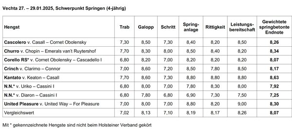 Es folgen alle Ergebnisse von Holsteinern in Vechta, unabhängig von ihrem Körstatatus beim Holsteiner Verband. Mit * gekennzeichnete Hengste sind nicht beim Holsteiner Verband gekört: