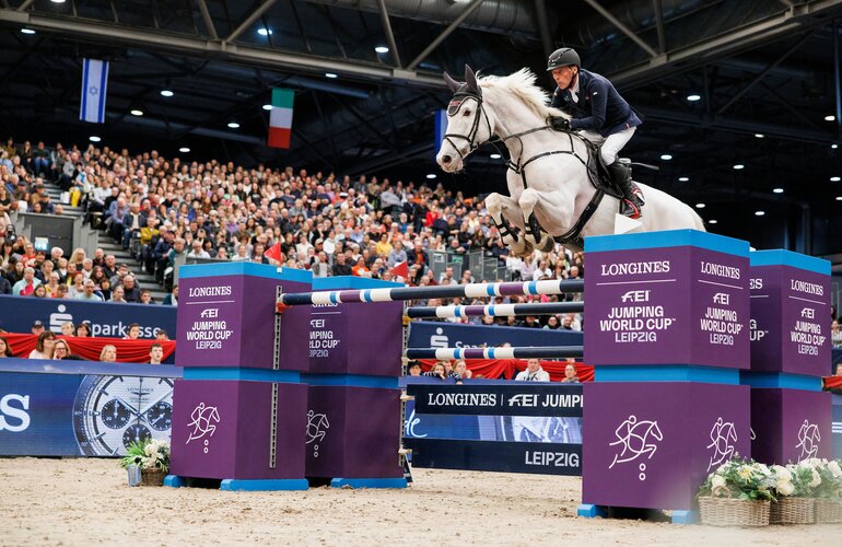 Einige Zeit sah es so aus, als würden Elysium v. Zirocco Blue-Coronado I (Manfred Tummes, Mühlheim), Stamm 4539, und Hans-Dieter Dreher den Sieg in der Weltcup-Station von Leipzig davontragen. Aber dann mussten sich der Schimmel uns sein Reiter doch mit der Bronzeposition in dem 1,60 Meter-Springen zufriedengeben.