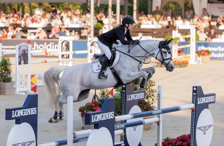 Ebenfalls an dieser Stelle siegreich war die Bereiterin des Stalls Meyer-Zimmermann, Paris Vandousselaere (BEL): Sie sprang mit Cachonda v. Cachas-Asca (Friedrich Meyer, Nottfeld) zum Sieg über 1,40 Meter – wiederum ein reines „Familienprojekt“ mit Nottfelder Wurzeln, denn auch den Hengst Cachas hat Friedrich Meyer – Vater von Janne Friederike – selbst gezogen.