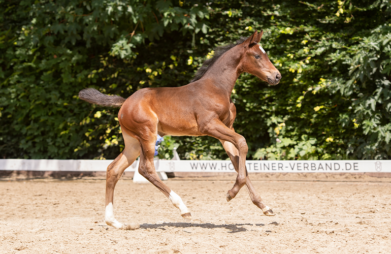 In der Fohlenkollektion reiht sich nicht nur das Who-is-Who der Vererbergrößen und aufstrebenden Junghengste aneinander, auch die Leistungen der Stutenfamilien beeindrucken auf ganzer Linie: Zum Beispiel hat die Katalognummer 38, Ernesto v. Eldorado van de Zeshoek-Calido I, die Weltmeisterin und Olympiateilnehmerin Taggi v. Landgraf I (Sören von Rönne/GER) als dritte Mutter. Diese wiederum brachte unter anderem den gekörten und unter Charlotte von Rönne (GER) 1,60 Meter-erfolgreichen Cartani. Die Katalognummer 65, Victory v. Vigado-Sandro Junior, ist eng verwandt mit dem unter Marcel Marschall (GER) auf internationalem Parkett hochdekorierten Coolio v. Casalito. Victorys Großmutter stellte Marschalls aktuelles Top-Pferd, das in diesem Jahr zum Beispiel zum deutschen Bronzeteam im Nationenpreis von St. Gallen (SUI) zählte. Die Katalognummer 36 v. Dourkhan Hero Z-Cayado heißt Douglas: Dieses ansprechende Hengstfohlen ist ein Halbbruder des Holsteiner Siegerhengstes von 2023, Diamantado v. Diamant de Semilly. Eine hochinteressante Offerte stellt auch die Katalognummer 8 dar. Ein seltenes Hengstfohlen des Carthago aus einer selbst S-platzierten Toulon-Mutter, das den passenden Namen Carpe Diem trägt.