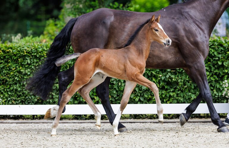 Da wäre zum Beispiel die Katalognummer 9, Sunflower v. United Way-Casall aus dem sporterprobten Stamm 18A2. Mehrere 1,60 Meter-Pferde hat diese direkte Mutterlinie bereits hervorgebracht, unter anderem Chepetta v. Chepetto von Kevin Staut (FRA) oder aber Cilantro v. Cassini (Meagan Nusz/USA). Die Mutter des Stutfohlens ist zudem Vollschwester zum gekörten und bis 1,45 Meter erfolgreichen Hengst Castle Creek (Thomas Brandt/GER). Ebenfalls mit international renommierter Verwandtschaft kann außerdem die Katalognummer 14 aufwarten. Bei Smilla, einer Tochter des Million Dollar-Livello, ist es der Olympia- und Fünf-Sterne-Sieger London 52 von Laura Collett (GBR), der sich ganz besonders hervorhebt. Für die Olympischen Spiele in Paris gehört das Paar zu den hochgehandelten Medaillenfavoriten der Vielseitigkeit. Nicht weniger interessant: die Katalognummer 13, Especial Kalone v. Ermitage Kalone-Uriko. Dieser Enkel des Catoki kommt aus der direkten Mutterlinie von Pferden wie zum Beispiel Quick Nick v. Quinar (Jonella Ligresti Bonomelli/ITA), Soccero v. Singulord Joter, den Janne-Friederike Meyer-Zimmermann einst in den Sport brachte und Davis v. Diarado, der unter Rolf-Göran Bengtsson Mitte Juni Vize-Landeschampion der siebenjährigen Springpferde wurde.
