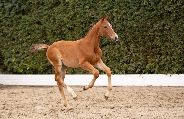 Und ein genauer Blick auf die Kandidaten lohnt sich! Das zeigen nicht nur die jüngsten Erfolgsgeschichten von ehemaligen Auktionskandidaten wie der frisch gekürten Bundeschampionesse der fünfjährigen Geländepferde, Lillet v. Livello-Calido I mit Andreas Dibowski, sondern auch die Pedigrees und Verwandtschaftsleistungen der streng selektierten Fohlen dieses Jahrgangs: Von Vererbern wie zum Beispiel Casall, Clarimo und Crack sowie Vingino, Cornet Obolensky, Quel Homme de Hus und Mumbai van de Moerhoeve stammen die Fohlen, die auch auf der Mutterseite genetisch wertvoll abgesichert sind. So zum Beispiel die Katalognummer 34, Töfte v. Tangelo van de Zuuthoeve-Caretino. Die Mutter dieses Hengstfohlens war selbst bis 1,45 Meter-Springen erfolgreich und die zweite Mutter brachte mehrere internationale Springpferde wie Online (Takashi Haase), Pikeur Cleveland (Michael Symmangk) oder Crook (Vladimir Malak). Für Freunde des Holsteiner Bewegungspferdes haben Roland Metz und sein Team vier vielversprechende Fohlen in das Lot aufgenommen. Zum Beispiel die Katalognummer 22, Bella Donna v. Benicio-Dolany, hat die in Holstein frenetisch gefeierte Mira G zur zweiten Mutter, deren Tochter Annabelle mit Helen Langehanenberg als Reservistin der Deutschen Equipe für die Olympischen Spiele in Tokio gelistet war. Mira G ist außerdem Mutter der gekörten Hengste De Chirico v. Dolany und Amber v. Ampère.