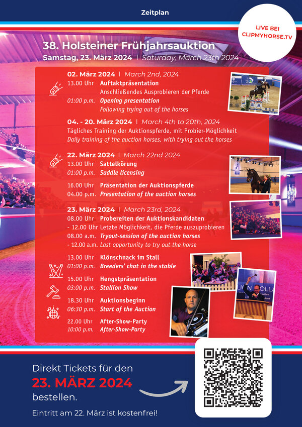Alle Fragen zur Auktion und natürlich den Pferden selbst beantwortet Felix Flinzer gerne telefonisch unter 0162-3493942. Alle Pferde sind online mit Fotos, Videos und Verwandtschaftsleistungen unter www.holsteiner.auction. Eine Möglichkeit zum Probereiten besteht noch bis Samstagmittag.