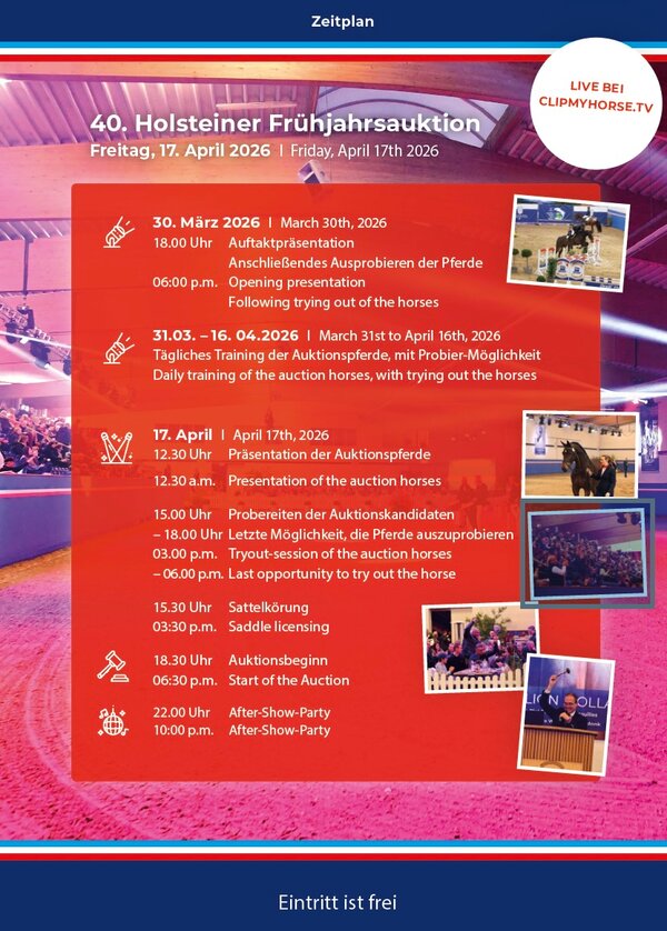 Am 17. April präsentiert sich die Kollektion um 12:30 Uhr live in der Fritz-Thiedmann-Halle und bei Clipmyhorse.tv im Stream. Anschließend ist ein letztes Ausprobieren möglich, bevor um 18:30 Uhr die Auktion eröffnet wird. Für Fragen stehen Felix Flinzer (+49 162 3493942), Alexandra Bitter (+49 170 3825465) und Sigrun Günther (+49 163 2469320) gerne zur Verfügung. Alle Informationen zur Auktion und zum Lot inklusive aller Videos sind online unter www.holsteiner.auction einsehbar. Die Bestandteile der Körung sind für 15:30 Uhr vorgesehen. Zuschauer sind bei freiem Eintritt herzlich eingeladen!
