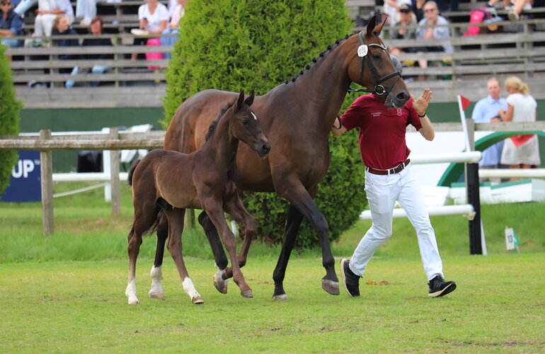 Dieses Hengstfohlen kann eine Mutterlinie allererster Güte vorweisen: Quints Großmutter Goriana van Klapscheut sprang mit Pilar Lucrecia Cordon (ESP) im Sattel zu zahlreichen 1,60 Meter-Erfolgen. Deren Mutter Coriana van Klapscheut wiederum war selbst auch auf Top-Niveau hochdekoriert und brachte unzählige weitere internationale Sportpferde. Hohe Begehrlichkeiten weckte auch ein Nachkomme v. Chaccothage Blue PS-Diarado: Chapeau stammt aus der Zucht von Axel Schwitzkowski (Raa-Besenbek) und war seinen neuen Besitzern 19.500 Euro wert. Die zweite Mutter dieses Hengstfohlens stellte unter anderem die 1,60 Meter-Springerin Quinara v. Quinar Z (Hauke Luther/GER). 19.000 Euro investierten schwedische Kunden in Big Air SN – ein Hengstfohlen des Olympiasiegers Big Star aus einer Clarimo-Mutter (Brigitta Jonasson, Linderöd). Der Hammer von Auktionator Hendrik Schulze-Rückamp fiel bei einem Gebot von 17.000 Euro, als die elegante Vingino-Cellestial-Tochter Ruby B (Jens Böckenhauer, Boostedt) über den Rasen des Hauptstadions trabte.